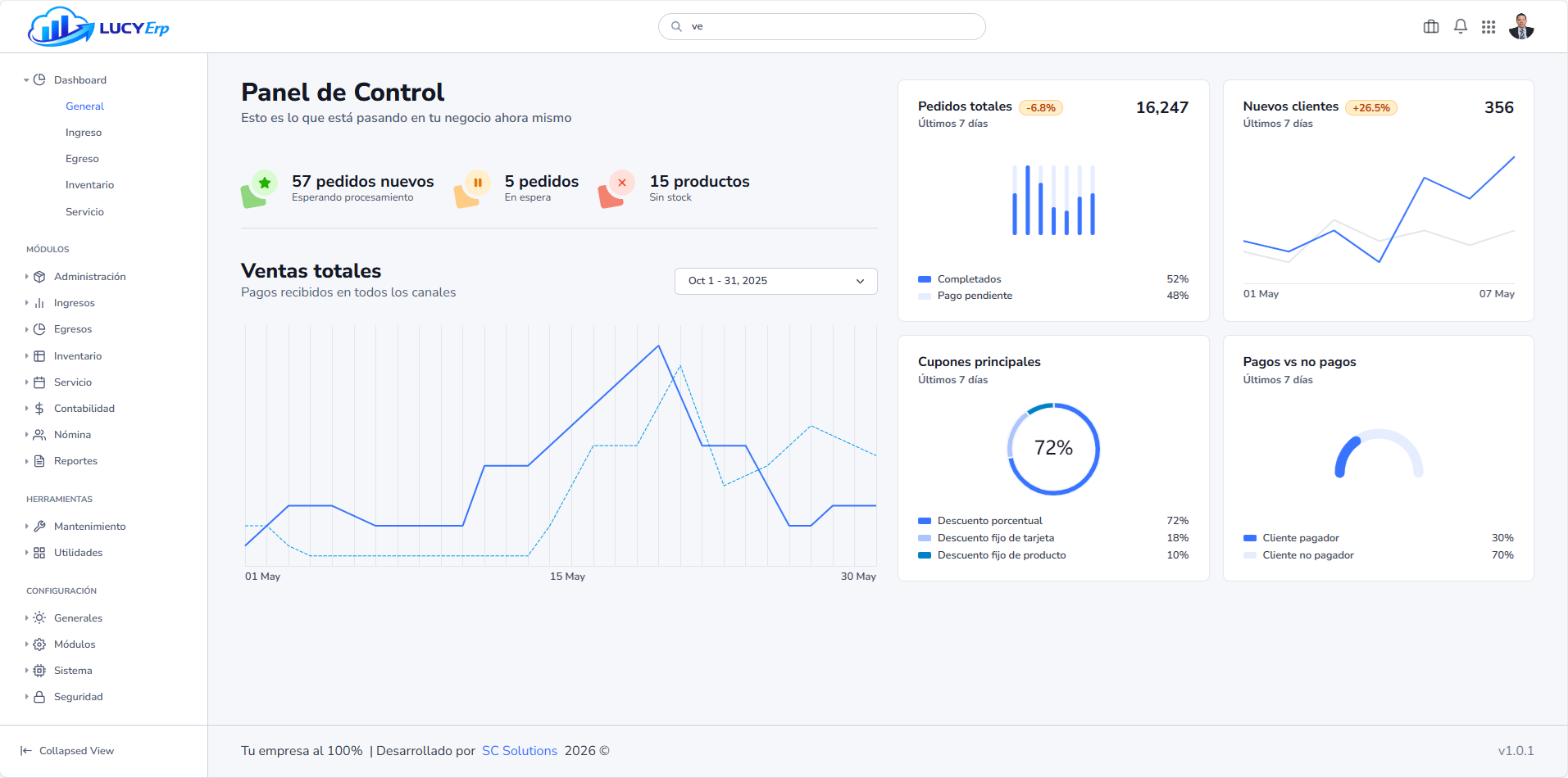 Sistema integral con módulos de Ingresos, Egresos, Inventario, Contabilidad, Servicios y nómina, y Acceso y seguridad del sistema. Optimiza procesos y toma decisiones desde un solo lugar.